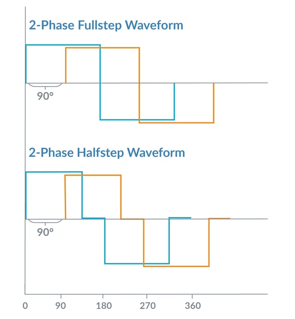 Figure 3 shows two traditional waveforms for driving a step motor. Step motors are a multi-phase device, meaning multiple motor coils are electrically excited to create motion. Most step motors have two phases but more exotic configurations such as 3-phase or 5-phase also exist.